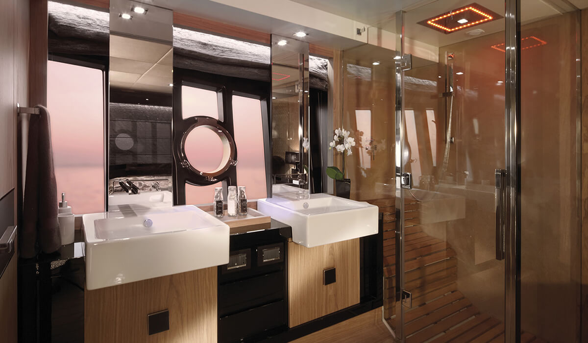 Furniture with lacquered top, wooden doors and ceramic sink with mixer tap - marin Wc - bidet shower - shower with teak grating, sliding rail, mixer and diffuser - crystal shower box - wooden floor - mirror - led type spots - S/S opening porthole - venetian wooden curtains - bathroom accessories.
